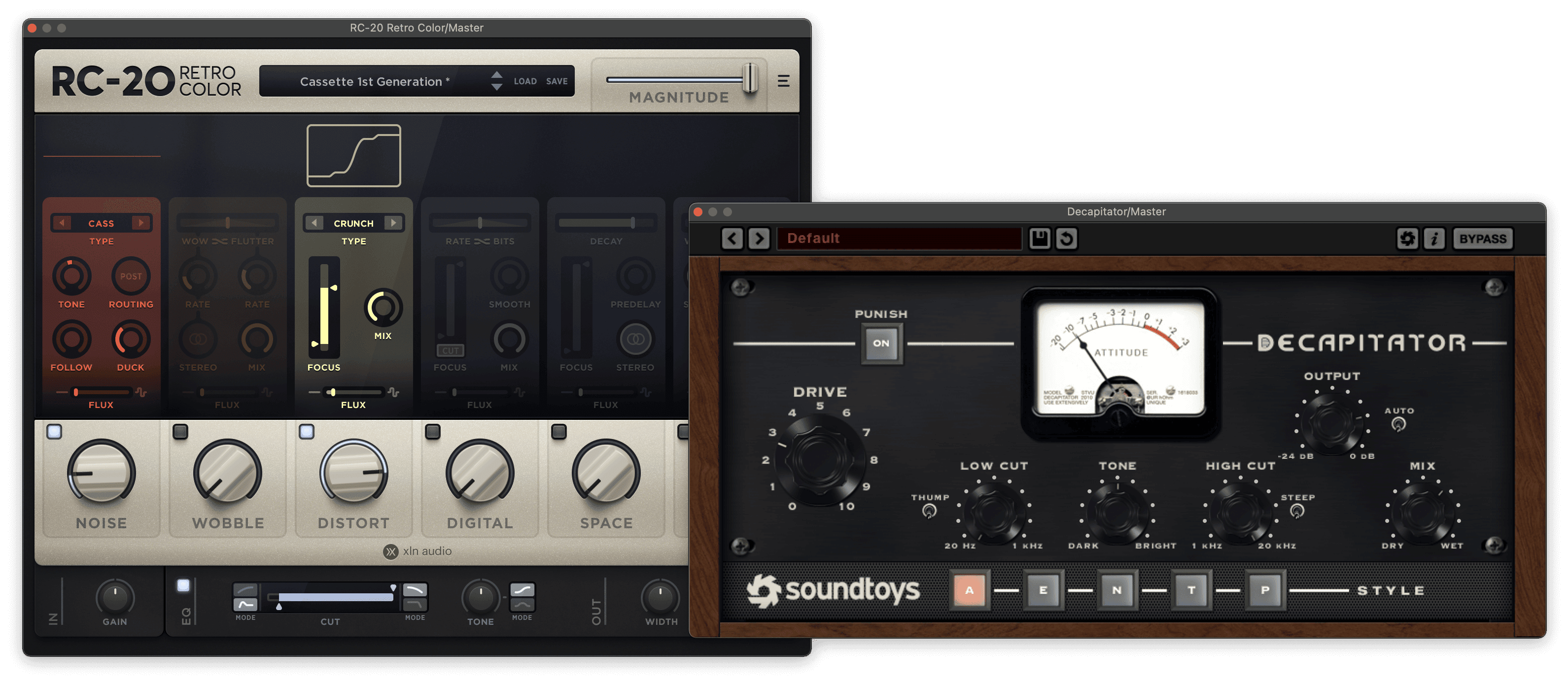 I used plugins on the master channel to replicate the noise and distortion of SAW 95-92, first using Soundtoys Decapitator with Drive around 3 to add light distortion. I then used XLN RC-20 Retro Color’s Cassette 1st Generation preset to add cassette-style noise and additional distortion. Listen to the results below and notice how different the clean and distorted versions sound.