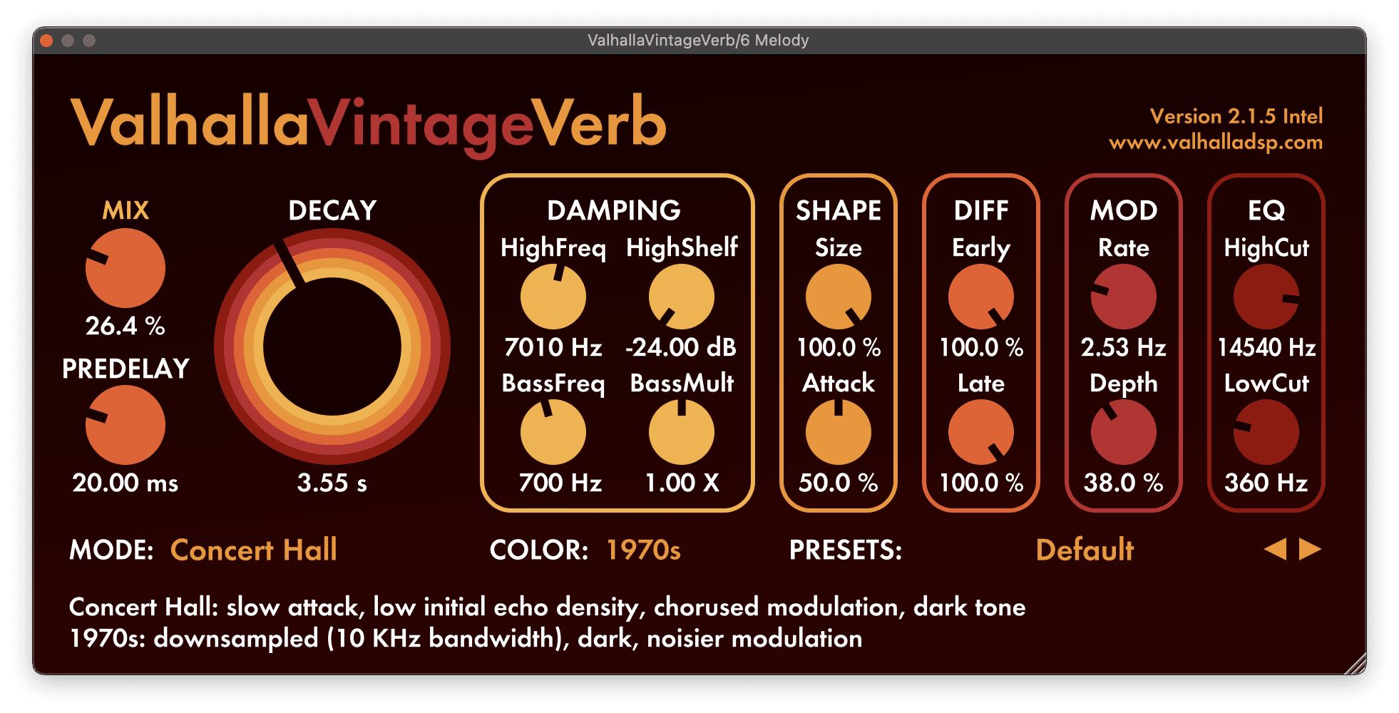 The reverb comes from the Alesis Quadraverb, which was used on every track on SAW85-92. I replicated the sound with Valhalla VintageVerb, which is based on digital rack reverbs from the same era. I set the mix level to 26% and played with the onboard EQ and damping settings to create a brighter reverb sound with more high-end. Here’s my patch, with and without reverb: