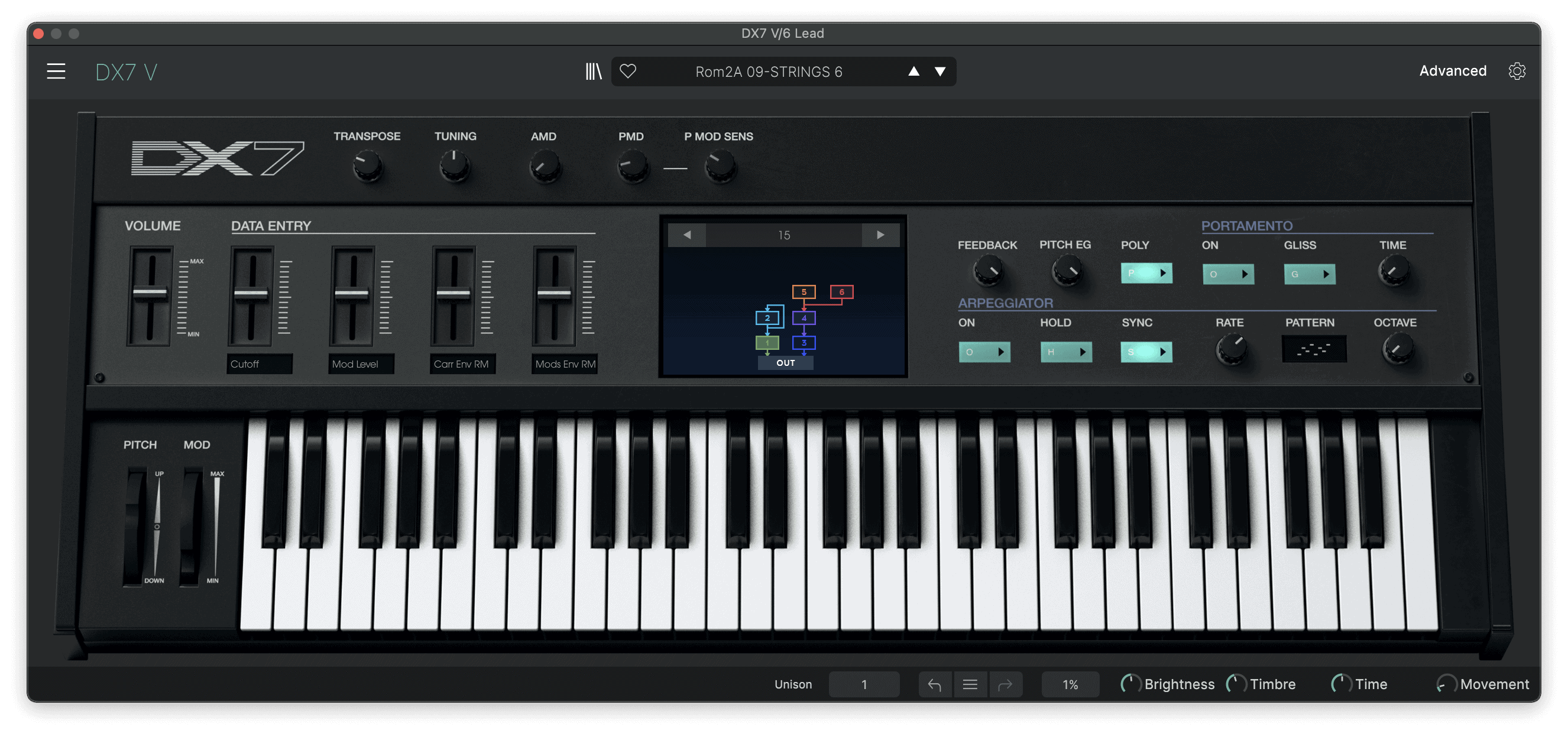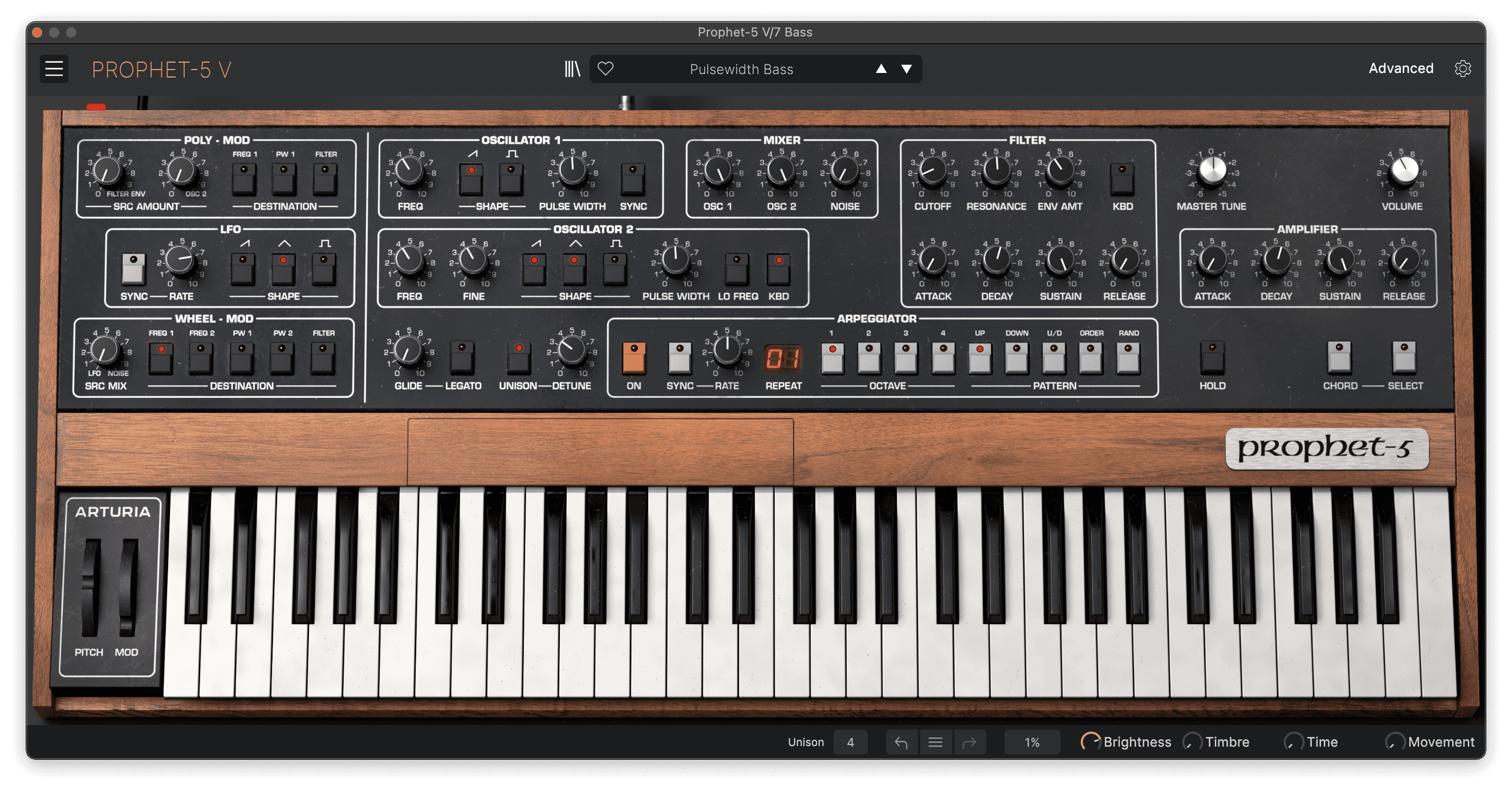 The chunky bass of Pulsewidth uses unison with detuned sawtooth waves to create a thick sound. The filter has high resonance, which gives it a distinctive nasal sound. My Prophet-5 V patch uses unison mode with detune amount set to 3.62 and resonance set to halfway.