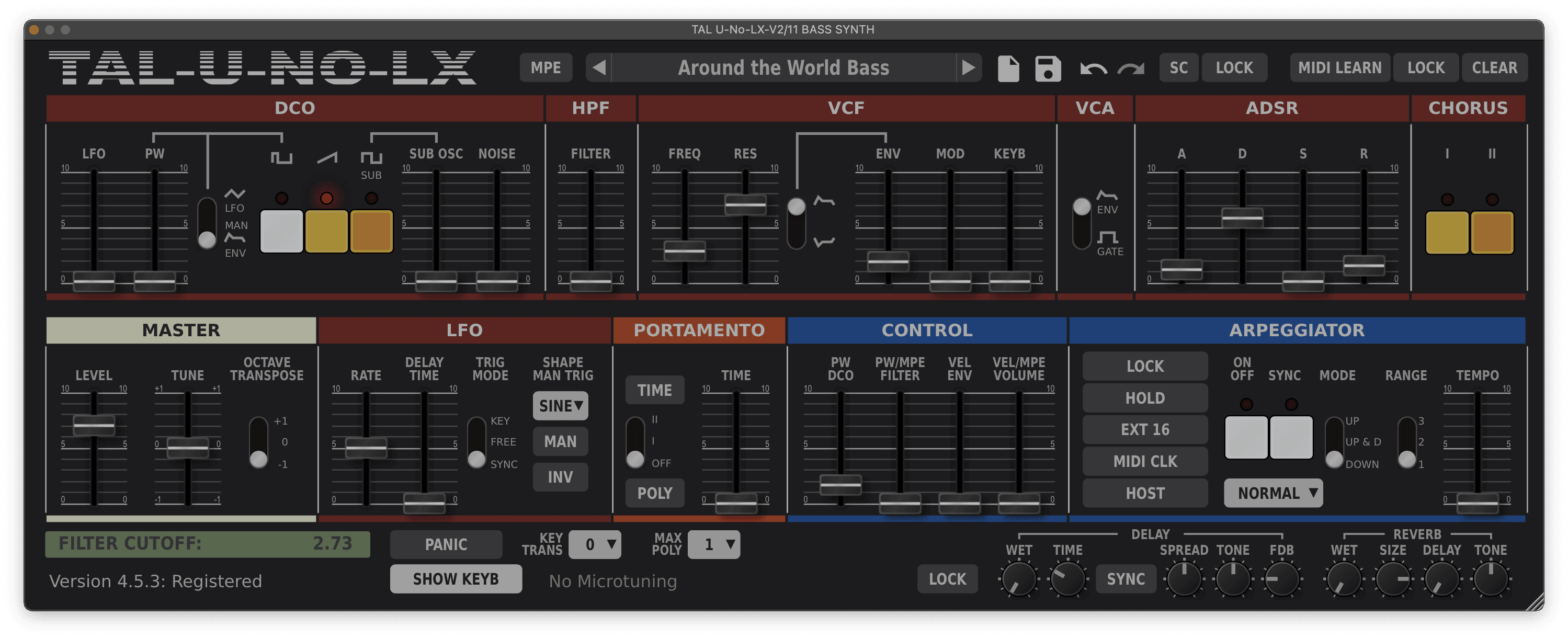 Add a tiny amount of envelope modulation by raising the ENV fader to 2 and set the ADSR envelope with an attack time of 1, decay of 6 and no sustain to give the patch a subtle pluck. Here are all three basslines played using my TAL U-NO-LX preset: