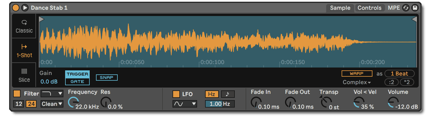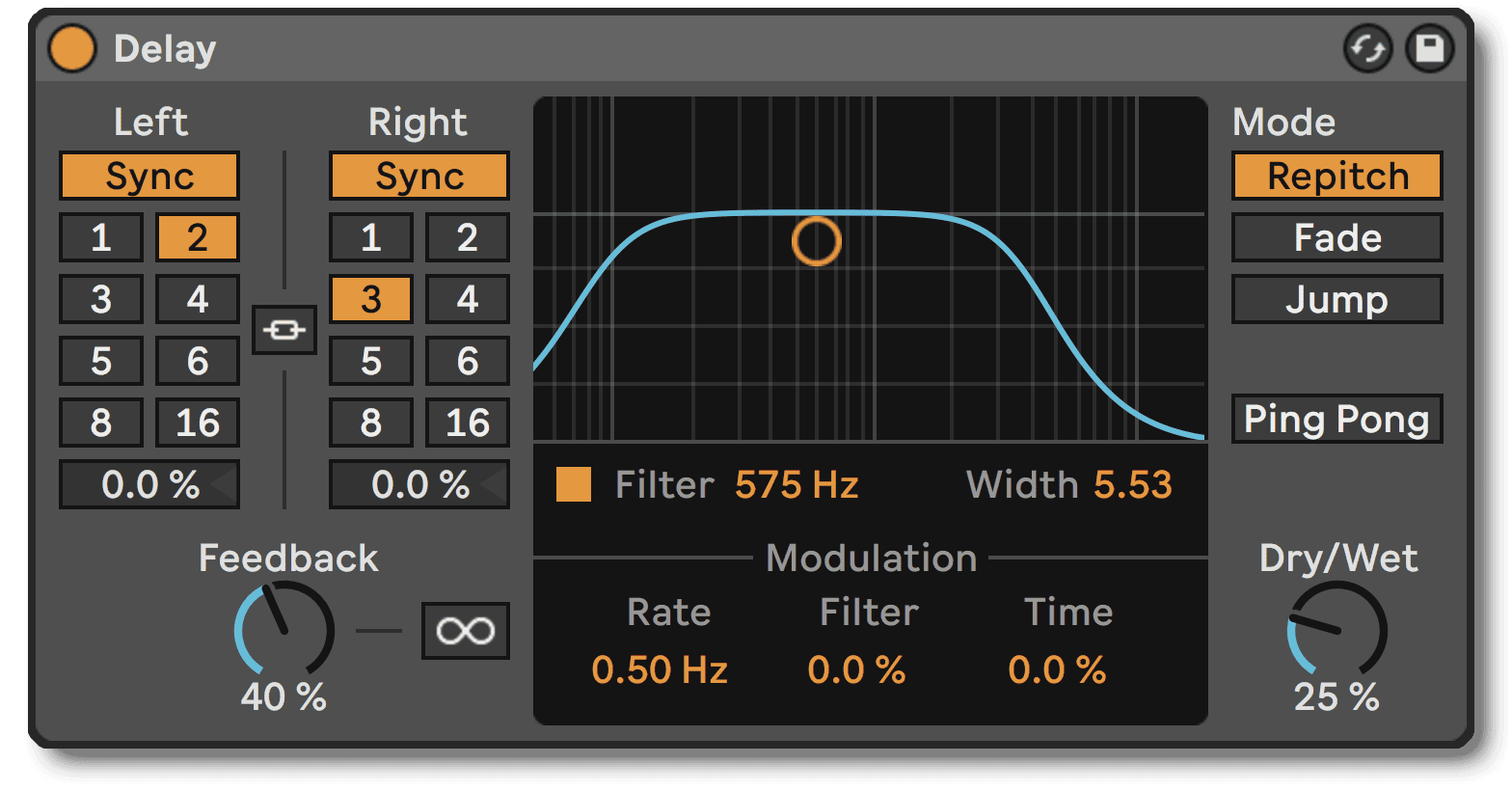 The delay effect is a tempo-synced stereo delay with a 1/8th note delay time in the left channel and a dotted 1/8th note delaying the right channel. The mix level is 25%, feedback is 40%, and I adjusted the delay’s onboard filter to roll off the high frequencies. Here are my settings using Ableton’s Delay effect: