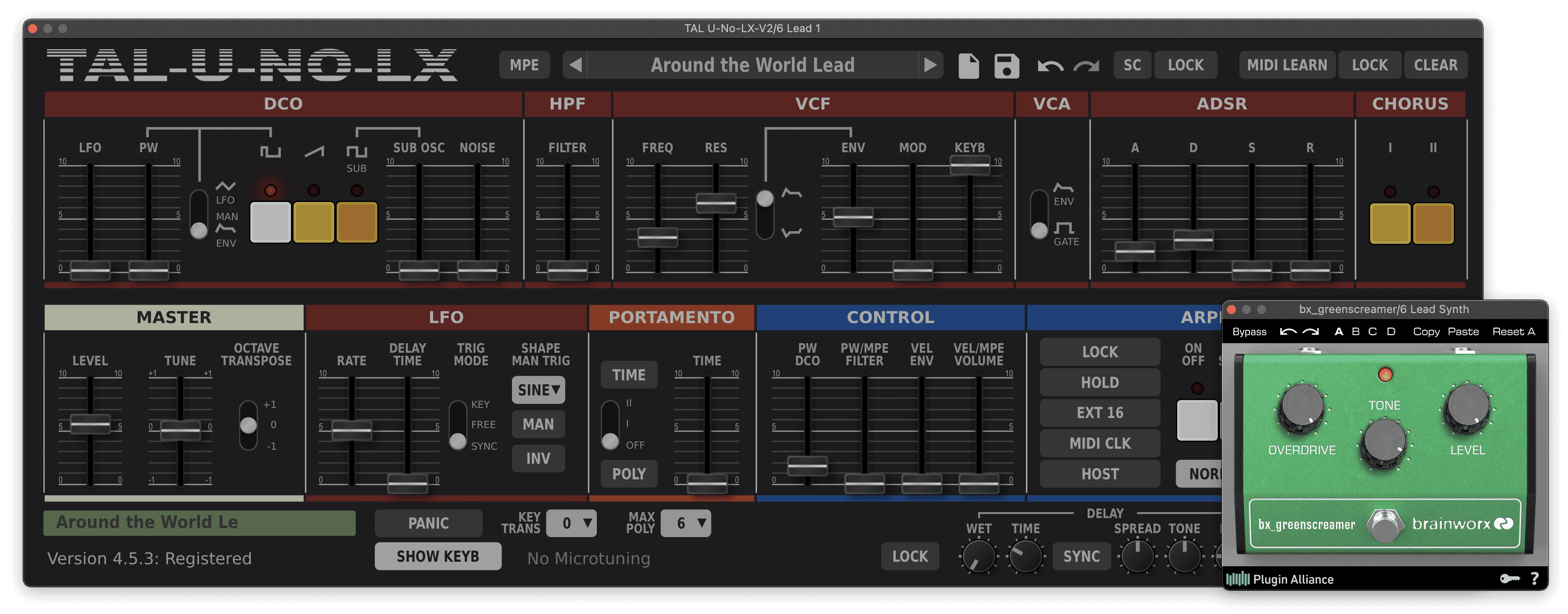 recreated the lead sound using TAL U-NO-LX, a software emulation of the Juno-106 run through the Brainworx bx_greenscreamer plugin, which emulates an Ibanez Tubescreamer pedal. Onboard distortion and overdrive effects in guitar amp simulators like Guitar Rig or Amplitube would also be suitable. Most of the sound comes from the character of the distortion pedal, so experiment with different models for different sounds.
