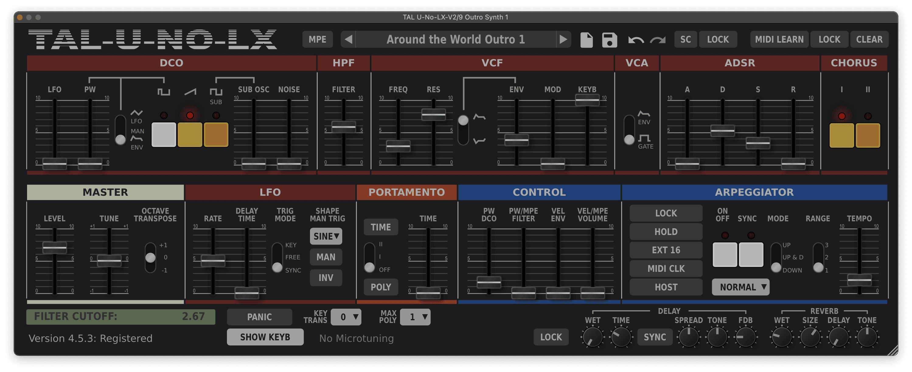 Daft Punk could have recorded the Around the World synth-bass on any of their synths, but I’ve recreated it in TAL U-NO-LX. To create the patch yourself, start with a simple sawtooth wave, lower the filter to 2.7 and crank the resonance to the point where it’s high but not quite screeching (6.89 in TAL U-NO-LX).