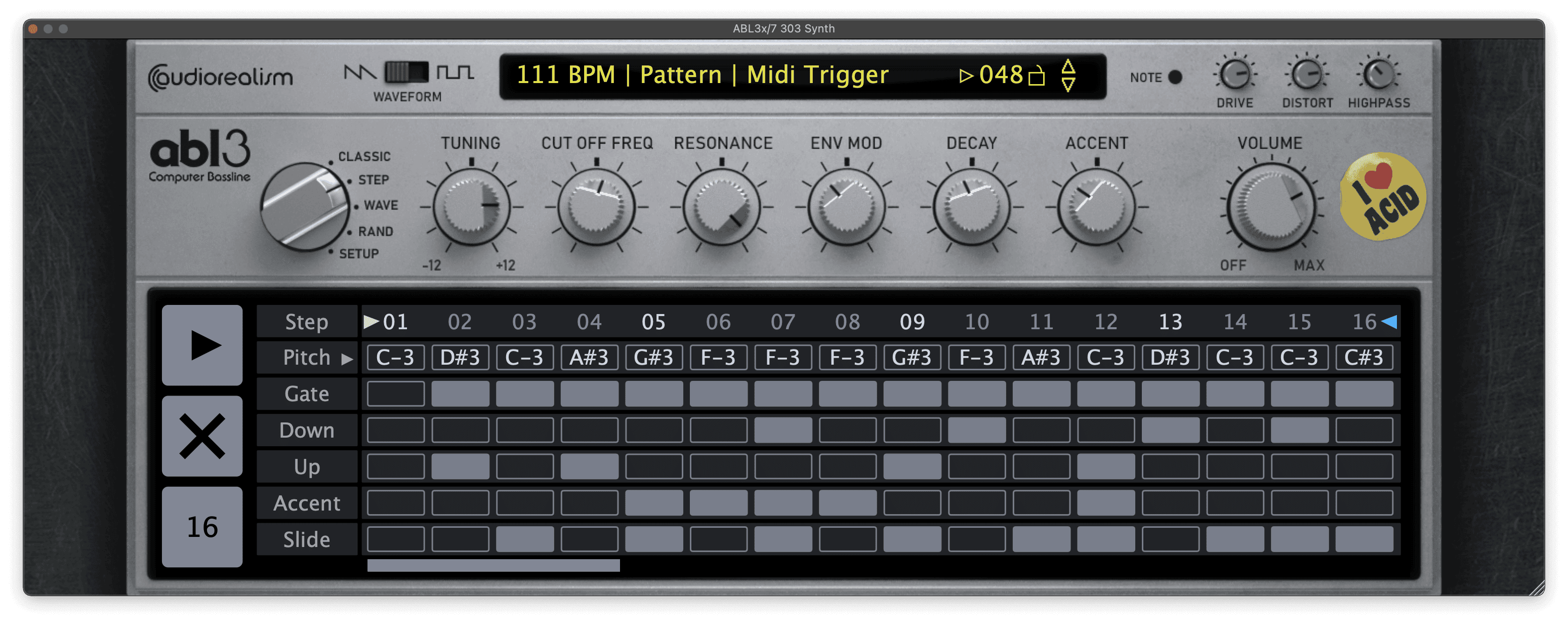 Below is my patch for Da Funk using AudioRealism’s ABL3 plugin, an accurate software emulation of the TB-303. Similar to the lead sound, the 303 in Da Funk has been run through a distortion pedal. The ABL3 plugin features onboard distortion which can be added via the small drive and distort knobs at the top-right, which I’ve cranked to almost the maximum settings.