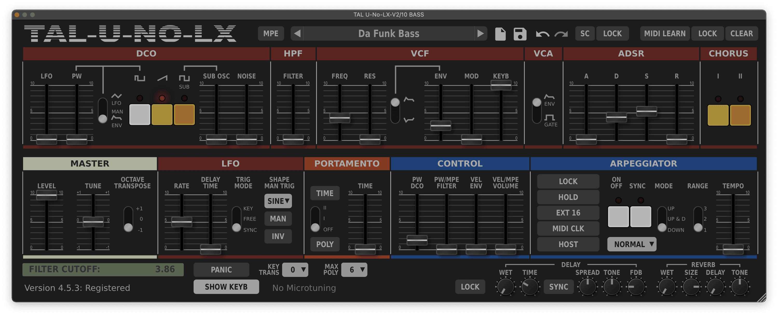 I again recreated this sound using TAL U-NO-LX, this time with the square wave DCO waveform selected. Set the filter to 3, resonance to 6 and envelope modulation to halfway. The envelope has attack time set to 2, which works with the resonance setting to create a funky wah-wah sound.