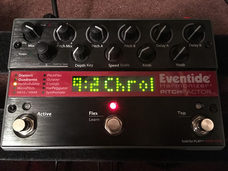 The Eventide Pitchfactor is a powerful harmonizer pedal, able to process the guitar signal and add additional notes to create harmonies, either in fixed intervals (chromatic) or based on a musical key (diatonic).