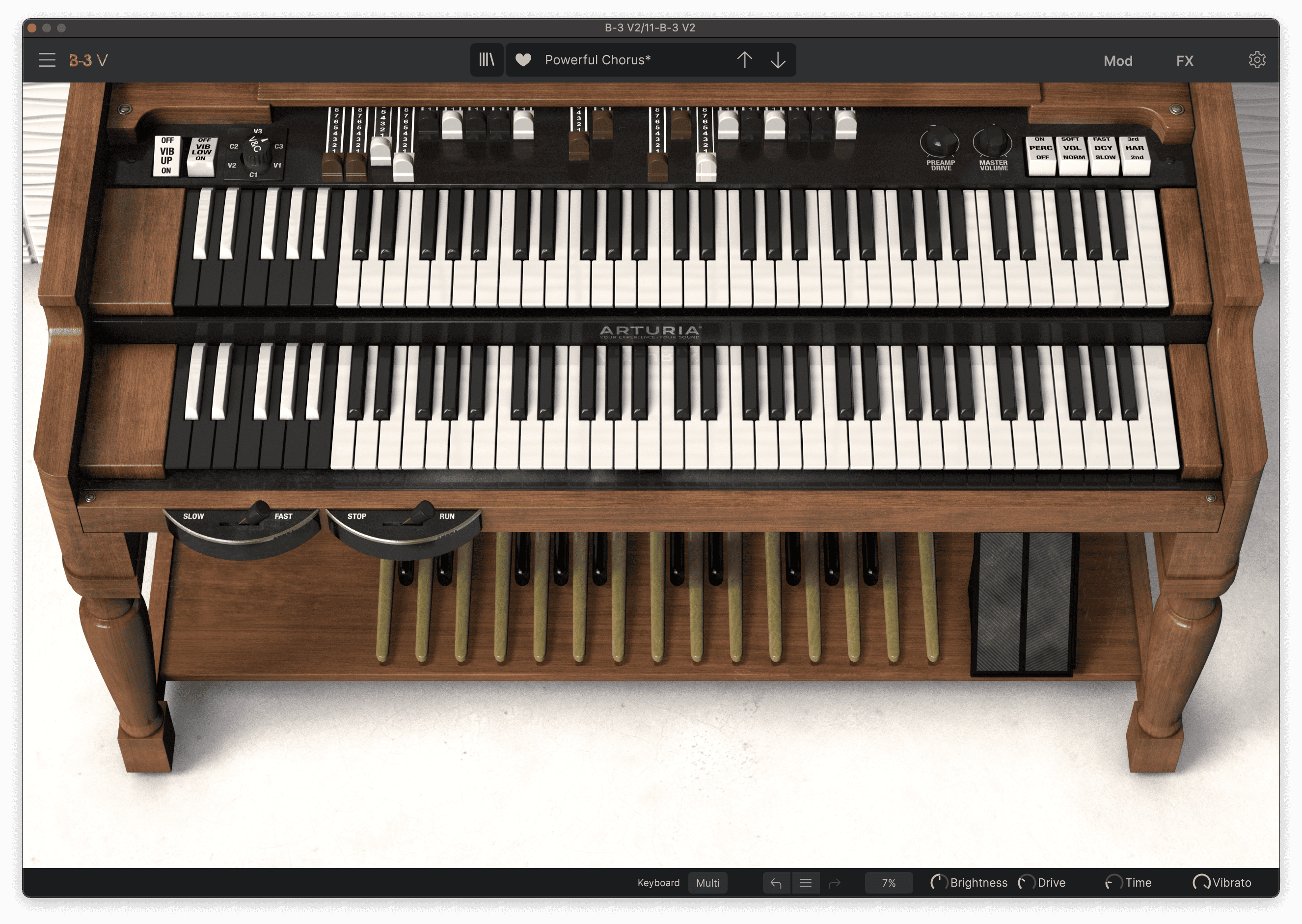 There’s a classic Motown/soul sound playing through Lost, which is chord stabs on beat 2. This is a layered sound, with guitar stabs panned hard left, and organ stabs panned hard right. For the organ patch, I used the Arturia B3 V preset Powerful Chorus with the rotary speaker speed set to fast.