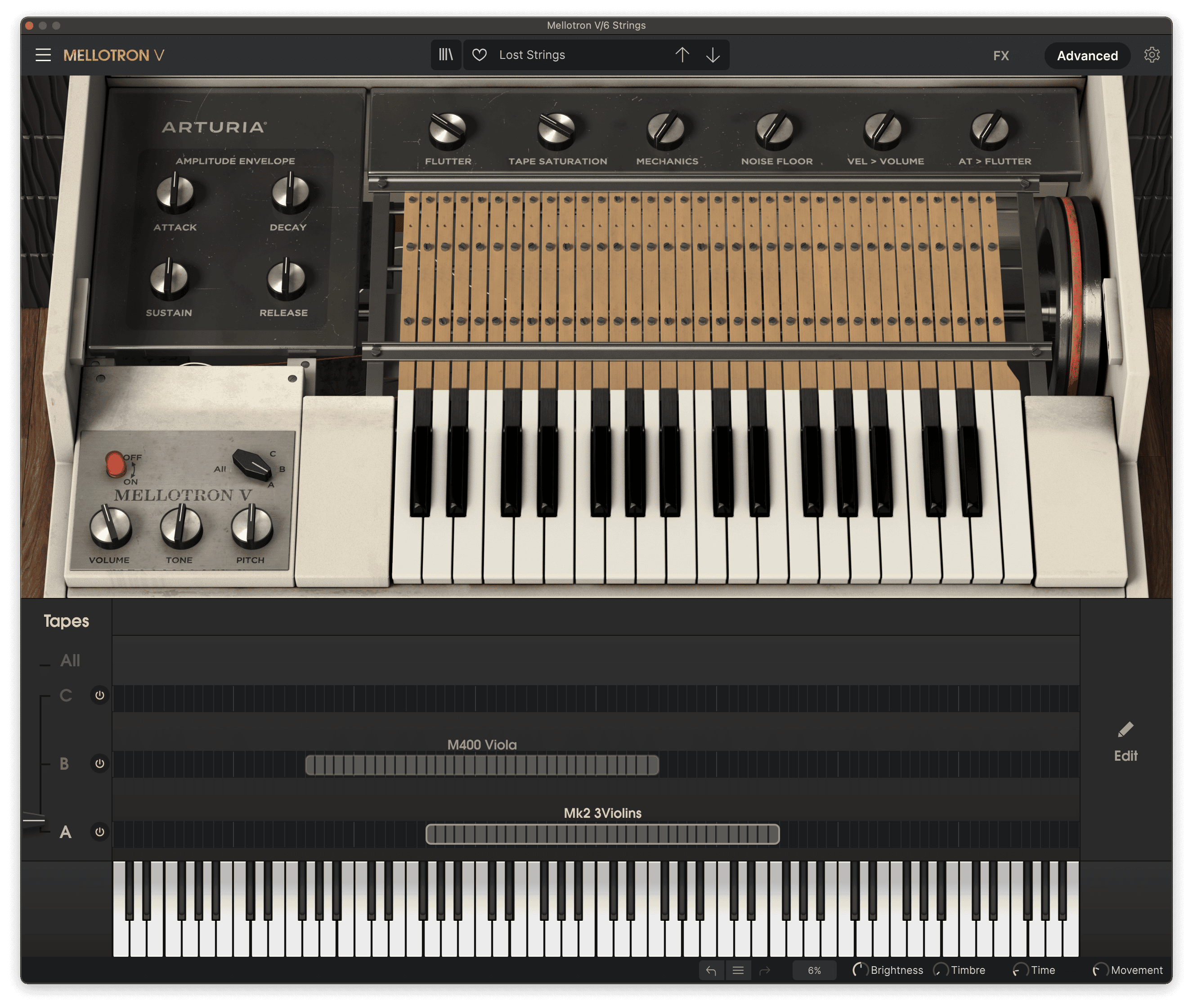 Most Mellotron plugins have the same core samples taken from the original Mellotron tape banks, so I’ve used Arturia Mellotron V for my Lost remake, as it’s part of the Arturia V Collection that I’m already using. In Mellotron V I used a custom preset using the Mk2 3Violins sample bank with the flutter and tape saturation controls raised about 1/3 of the way and some EQ to boost the high frequencies and match the tone on Lost.