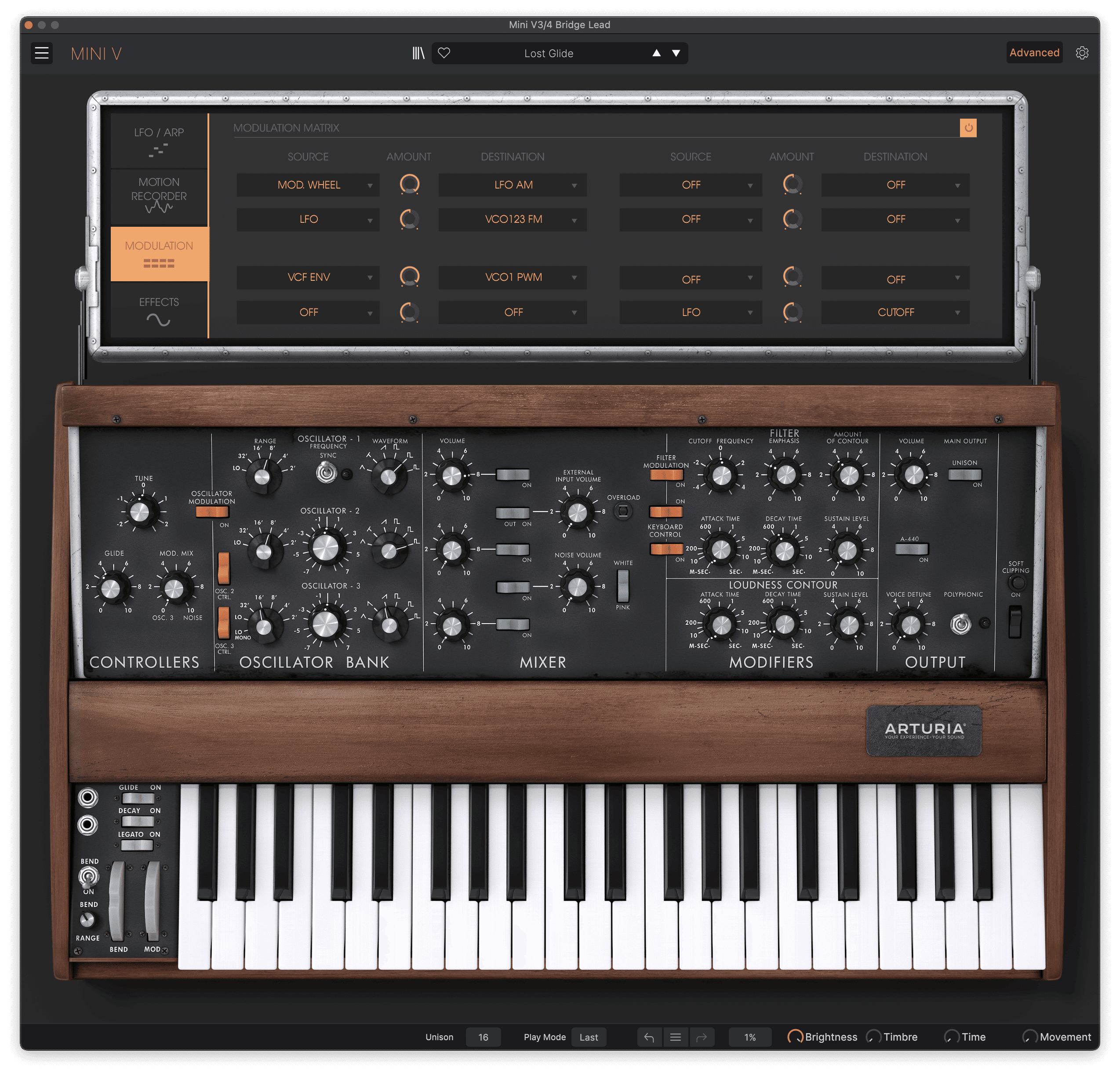 Portamento glide is activated with the Glide switch at the bottom left, and setting the glide time on the left of the panel to 3.6 gives the same portamento timing as heard in Lost.