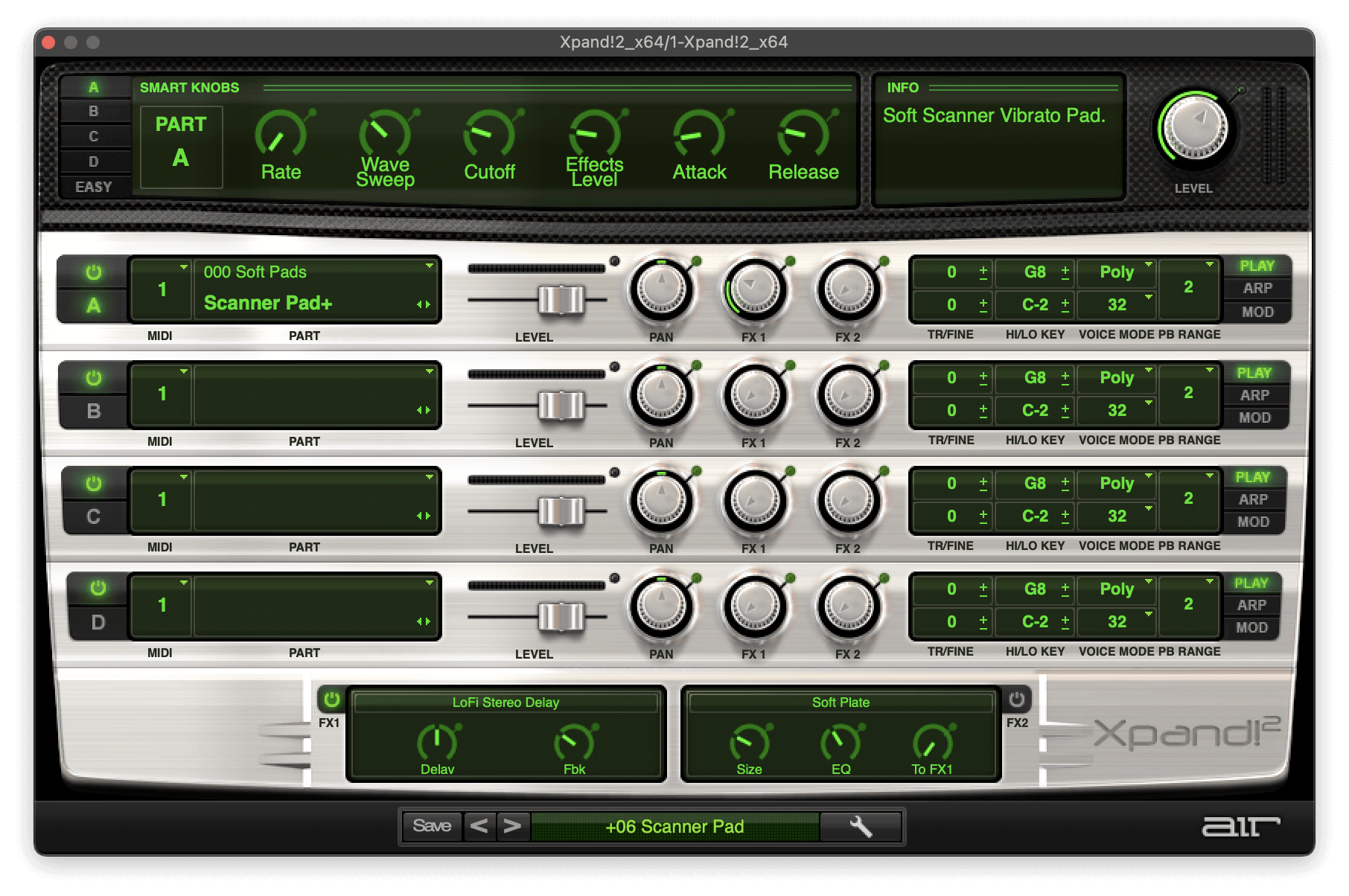Xpand!2 is a ROMpler that plays sounds from pre-recorded samples, which unfortunately means you can’t tweak the sounds. As a sound design nerd, I wanted to recreate the Scanner Pad sound, so I built two Arturia Prophet V patches that work as separate layers. The first layer is a long swelling pad, and this is the main sound. You can create the distinctive swelling effect in Arturia Prophet V by setting the envelope amount to 38 with envelope times of 1.1s attack and 3.1s decay.