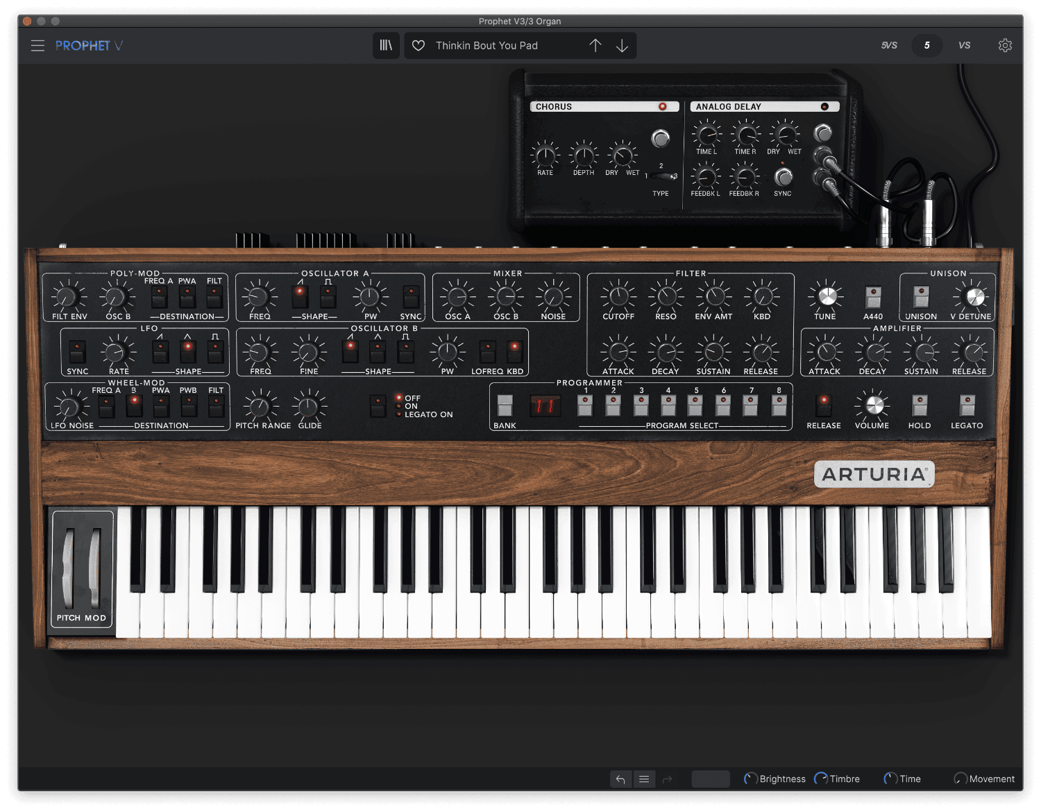 The organ sound is thin and only uses Oscillator A. This gives a single sawtooth sound instead of detuned sawtooth waves. There’s also no envelope amount in the filter section, so the patch is more static sounding. Lastly, set Prophet V’s onboard chorus to 50% dry/wet.