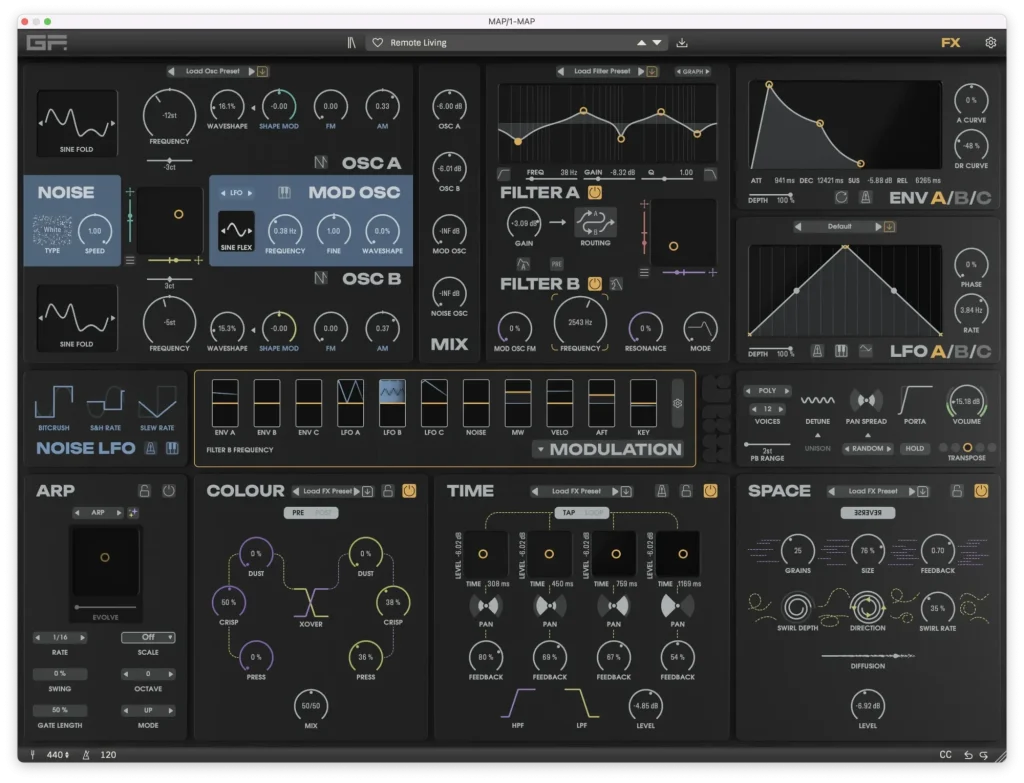 I created 40 factory presets for GForce MAP, a new instrument inspired by modular synthesis and west coast experimentation. It’s a deep and flexible synth with a lot of room to explore, and my favourite features are the Colour, Time, and Space effects, which are quite unique and add a lot of character to patches.