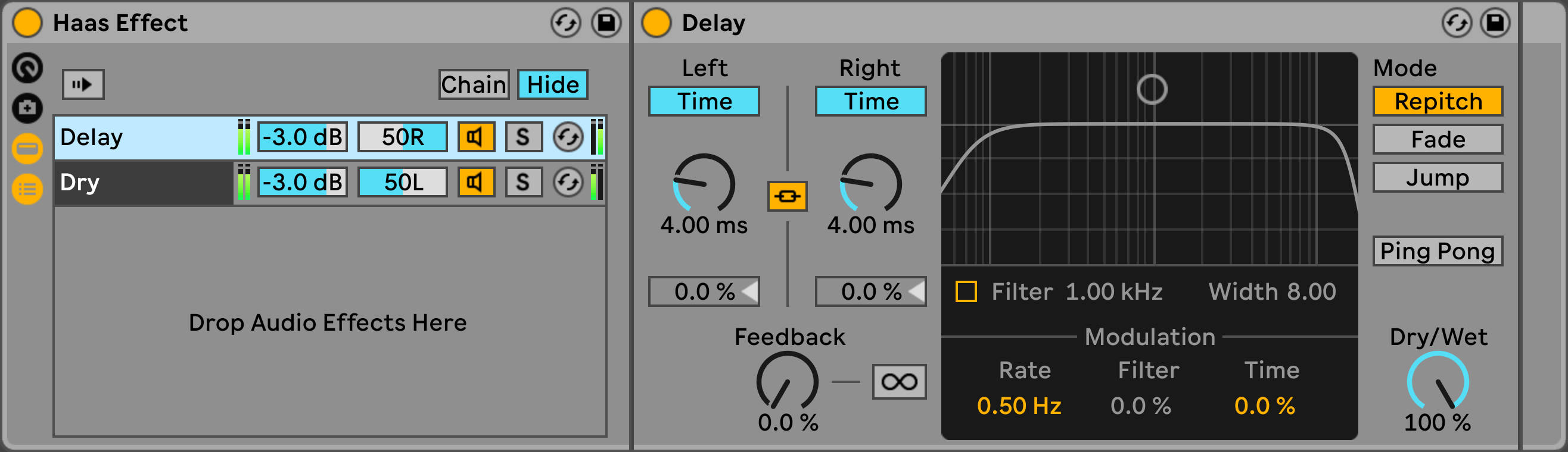The arpeggios in the original song have a wide stereo sound, but the DX7 patch is mono, so it needs to be widened in the mix. I did this in Ableton Live by creating a simple Haas effects rack with two chains.