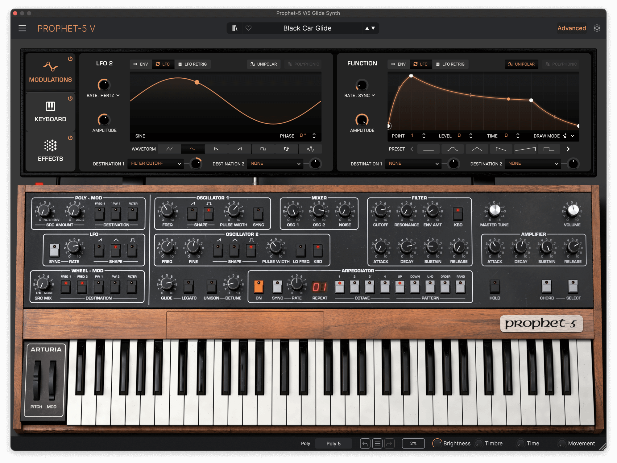 Towards the end of the song, a gliding synth line appears playing creatively detuned chords. I recreated this sound using Arturia Prophet-5 V. The key features of this patch are polyphonic glide between notes, a subtle but fast tremolo, and occasional pitch movement controlled with the mod wheel.