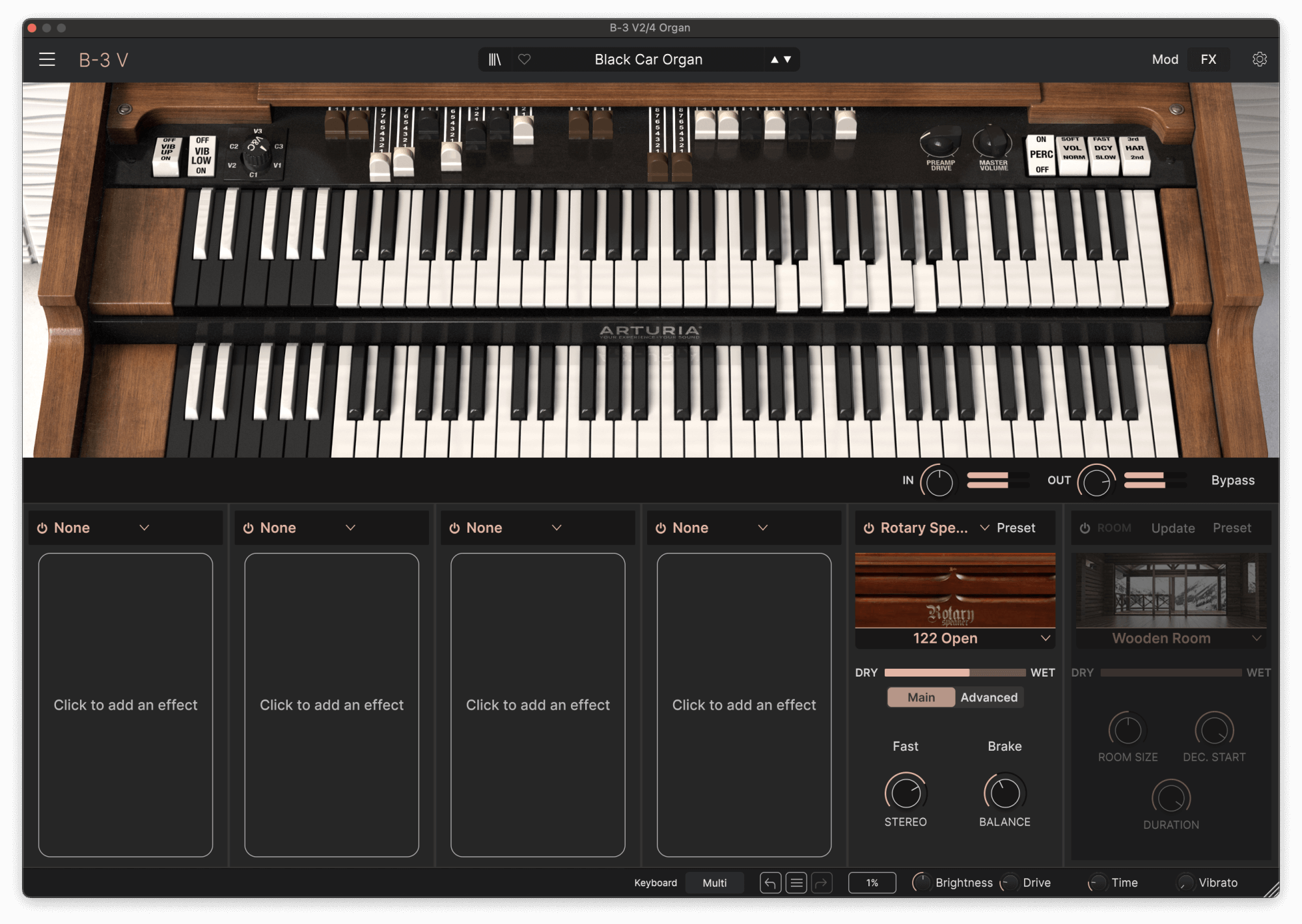 To recreate the chord sound, I built a custom patch in Arturia B-3 V starting from a blank init preset. I recreated the sound by setting the left-hand drawbars by ear to sound in the original track.