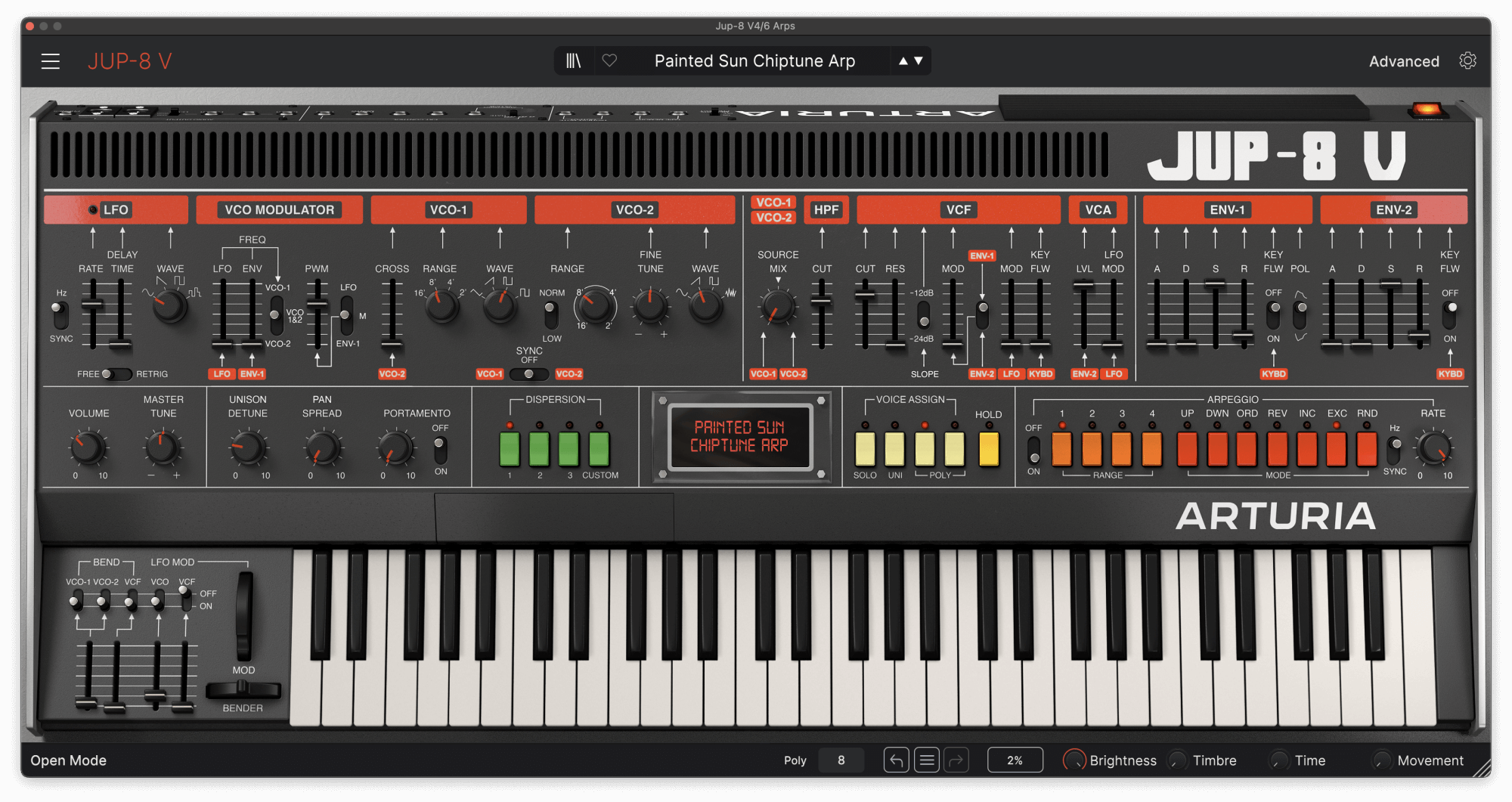 While I used Plogue Chipsounds in my In Motion remake, I wanted to stay within Arturia’s instruments for this project, so I used Jup-8 V4. The sound uses a pulse wave with a 66% pulse width, which gives a thin digital tone, and I filtered both the high and low end to leave only midrange. The arpeggiator is set to exclusive mode (up+down) and the arp rate is set to 41.6 Hz.