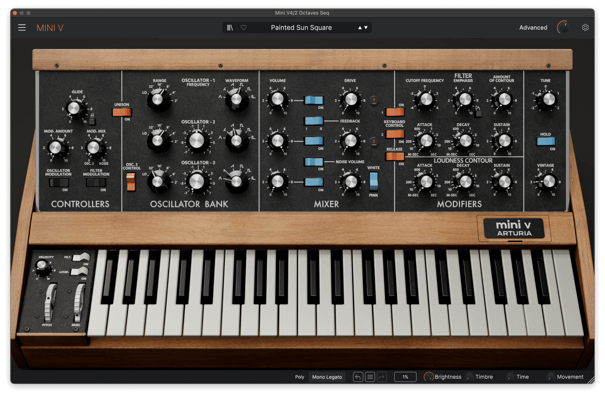The track opens with a simple octave-jumping synth sequence that outlines a descending chord progression. I recreated this sound using Arturia Mini V4 with a single square wave oscillator and the filter set to 1240 Hz. The filter doesn’t track the keyboard, which helps give the sound an even tone across the octaves.
