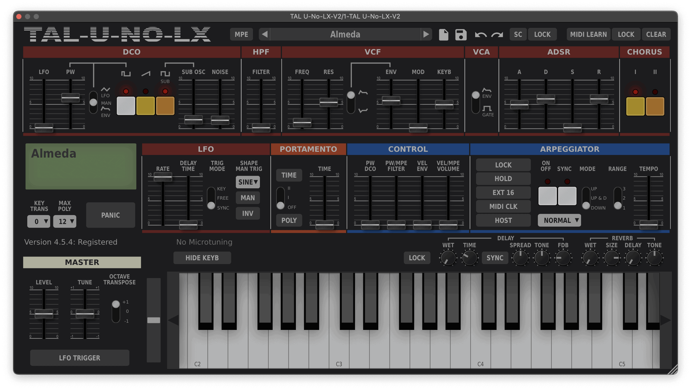 Easily my favourite track from the new album, Almeda is mysterious sounding and full of unusual composition and sound elements, all placed on top of a typical modern trap beat. Here I’ll concentrate on the synth lead and FM-sounding keys from the intro hook. The lead is heavily chorused, giving it a wide stereo effect. I used TAL U-NO-LX, however, both Prophet V and Mini V should also be able to handle the patch as both have onboard chorus effects.