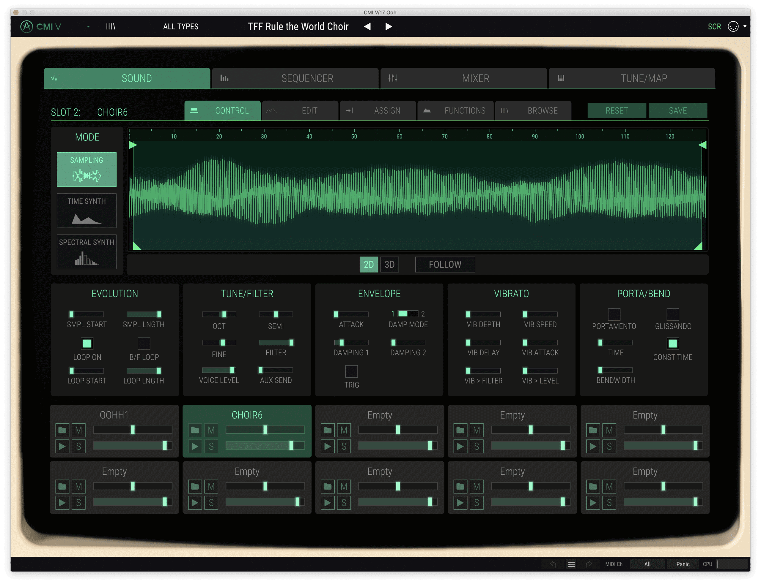 In my remake, I have them on separate tracks, with CHOIR6 mixed about 4dB lower and filtered at 2kHz to tame the high end. Detuning the CHOIR6 sample slightly also helps add natural thickness and chorus. I used Arturia CMI V to recreate this, here’s what it sounds like: