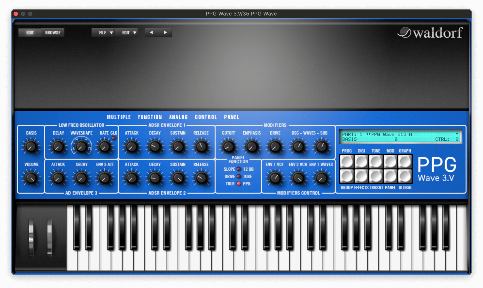 The PPG Wave layer comes from a modified version of the 013 A preset, with the oscillator wave setting lowered and the filter envelope depth reduced.