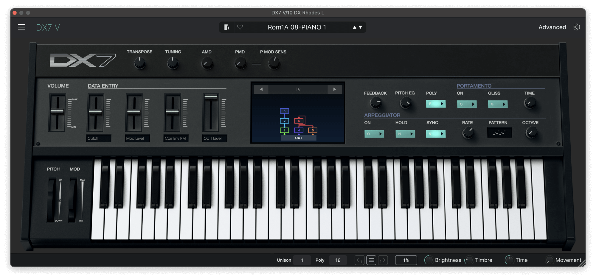 For the layered chord patch, they used two of the DX7’s stock electric piano sounds: ROM1A 08-PIANO 1 and ROM1B 01-PIANO 4. These are panned separately to create a wide stereo image, with PIANO 1 positioned to the left and PIANO 4 to the right.