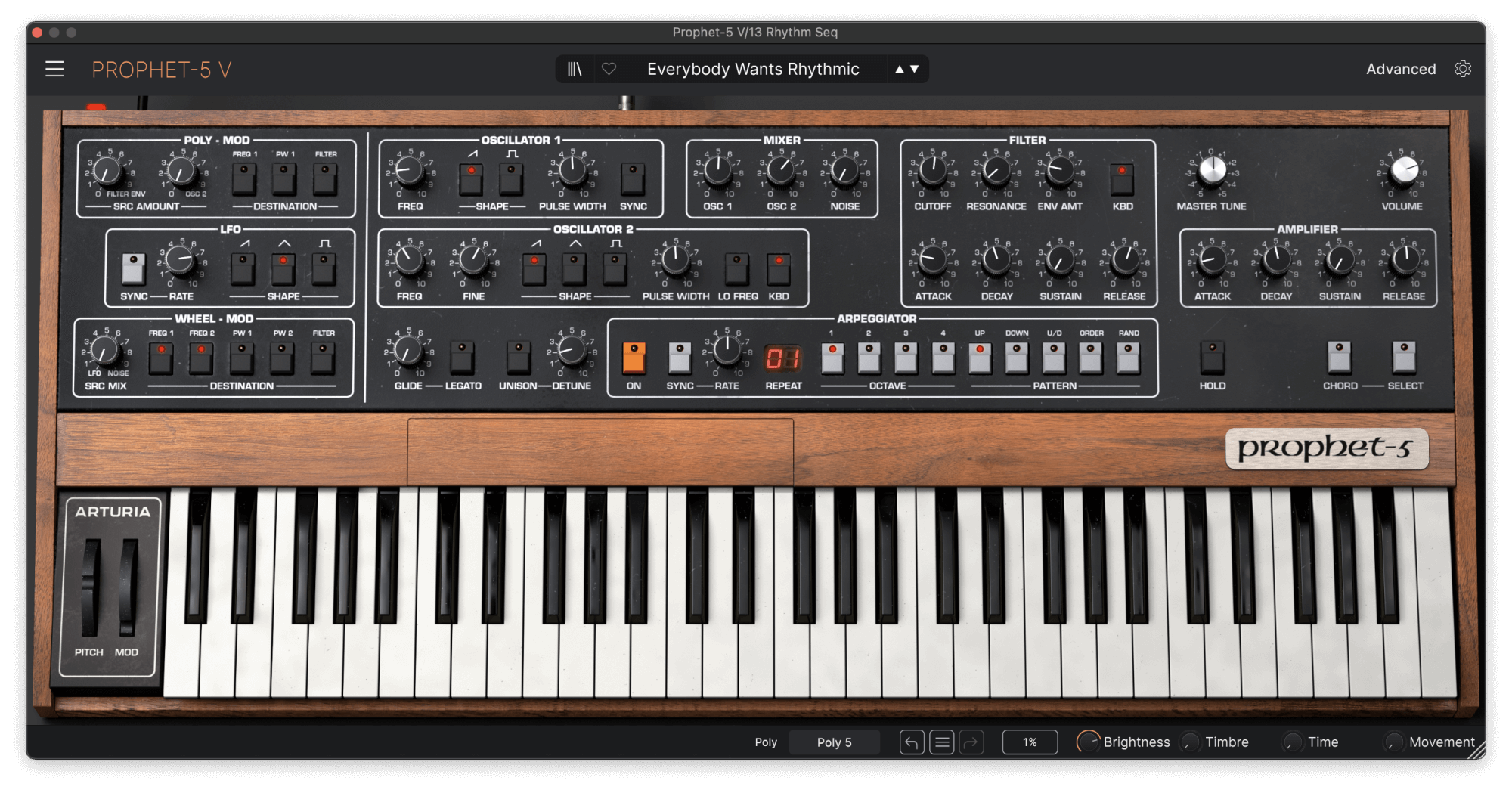 The key to its percussive quality is a very short decay—filter decay is set to 356 ms, and amplifier decay is set to 393 ms. Amp release is set to a low 147ms and I programmed short note lengths for the sequence. I used Prophet-5 V’s onboard chorus again, this time set to 50%, and added an EQ to roll off 5 dB of low-end frequencies.