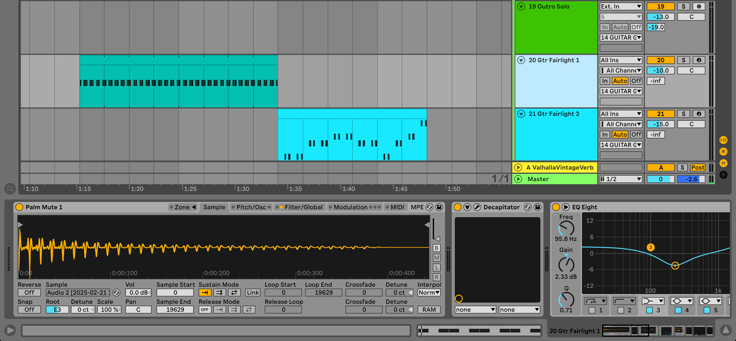 The first sampled guitar part plays a palm-muted low D in the same bouncy triplet rhythm as the bass in the verses. To recreate the sound, I recorded a palm-muted low E on guitar and loaded into Ableton’s sampler, triggering it a step lower than recorded. The second sampled guitar plays during the choruses and follows a similar idea, but instead of a single note, it’s a palm-muted fifth (or power chord).