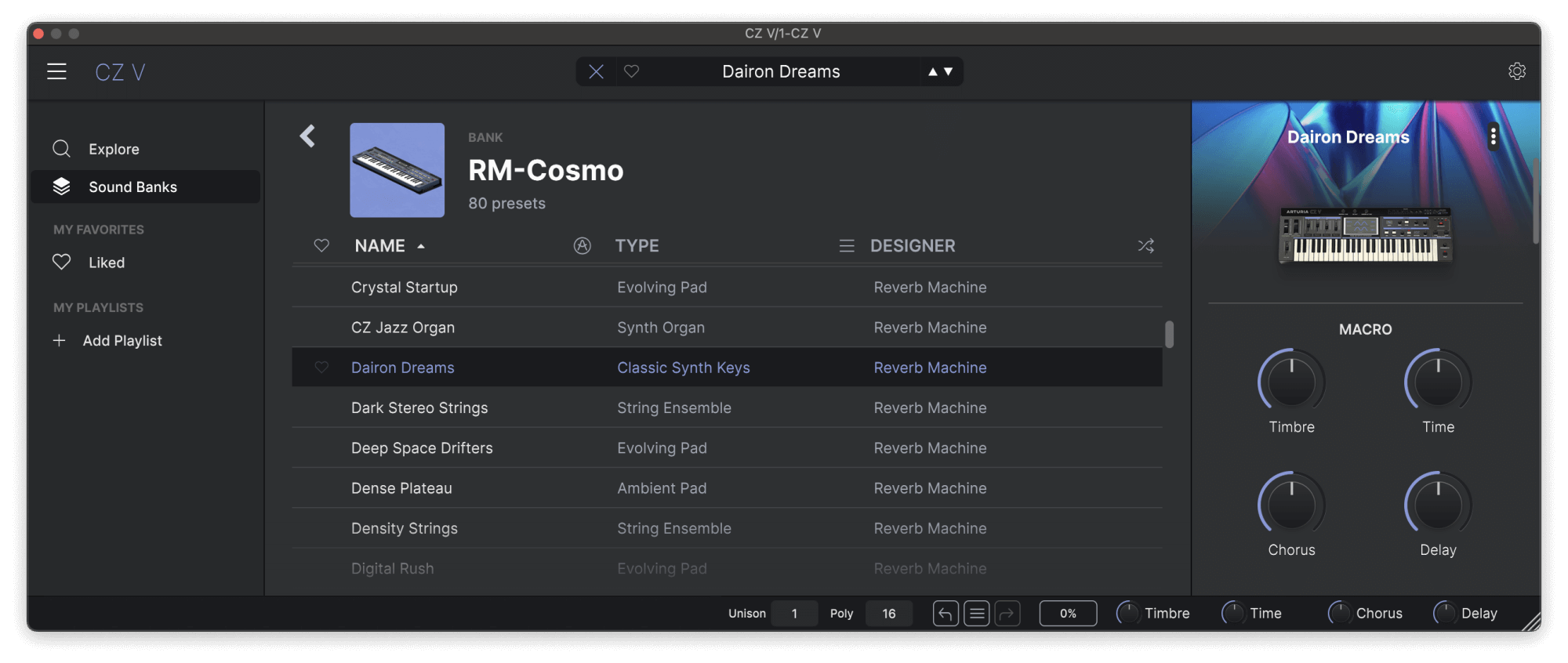 Cosmo is my new preset pack for the Arturia CZ V synthesizer, with a strong focus on unusual and esoteric sounds. This collection features 80 brand-new presets, exclusively created for this pack, including everything from distorted basses and evolving synth keys to ambient pads and generative arpeggiator patches.