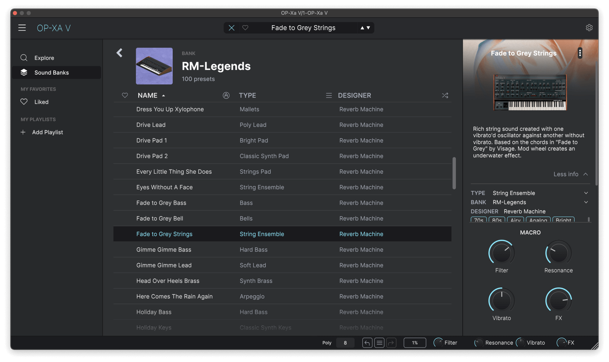 All presets in Legends make use of the onboard effects in OP-Xa, incorporating elements from the original production effects. The result is a set of sounds that stay true to the original recordings. The preset bank is also fully compatible with Arturia Analog Lab, including the free Analog Lab Play, providing the same classic sounds with Macro controls for seamless integration into your projects.