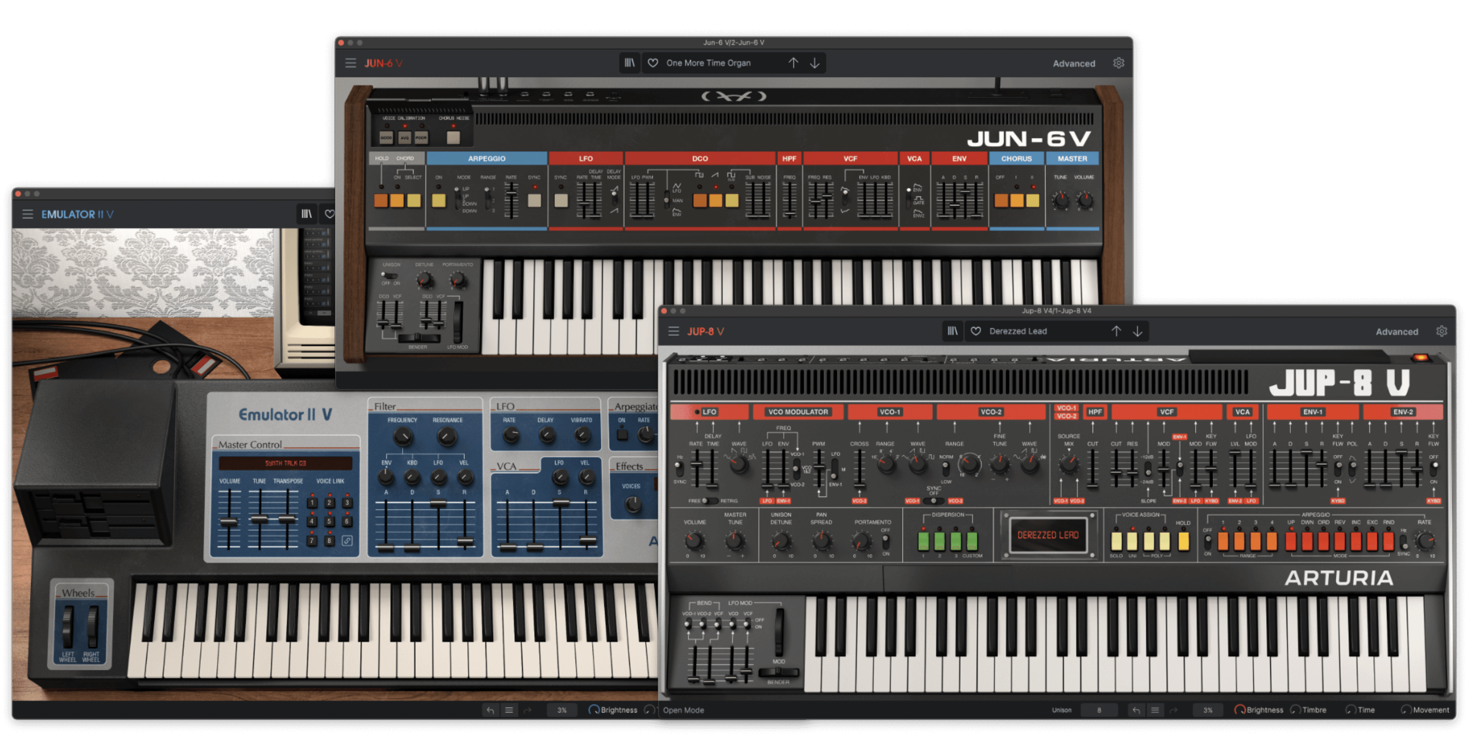 The 80 presets featured in Robot Funk were designed with three different Arturia softsynths: Arturia Jun-6 V was used to emulate the Roland Juno-106 sounds heard in the duo’s early albums, Arturia Jup-8 V4 was used to recreate more complex and distorted sounds, and Arturia Emulator II V was utilised for sampler patches featuring custom samples created for this pack.
